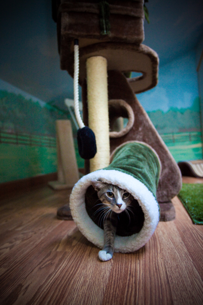 1. Our kitty playroom has a cat tree in addition to a variety of climbing, perching and scratching posts. These items encourage our feline guests to jump, reach, stretch and file down those sharp claws!