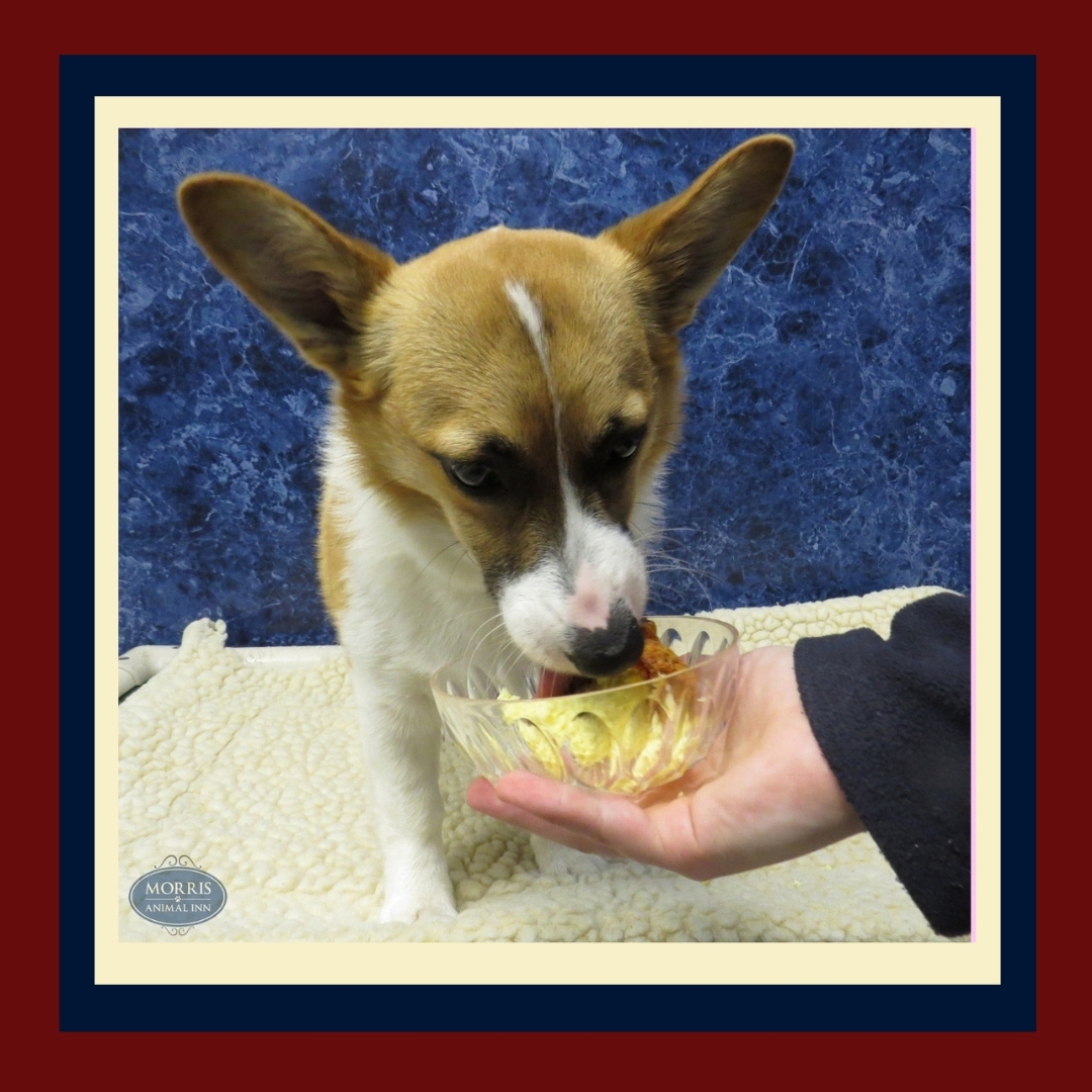 For dogs, put a bit of his regular food in a Kong, and then stuff a little boneless, skinless turkey, sweet potatoes and gravy in the Kong (very similar to what we offer at Morris Animal Inn for Thanksgiving boarders!). It’s not much food, but it will keep him occupied for a long time. For cats, you might consider offering some catnip in a safe, quiet room.